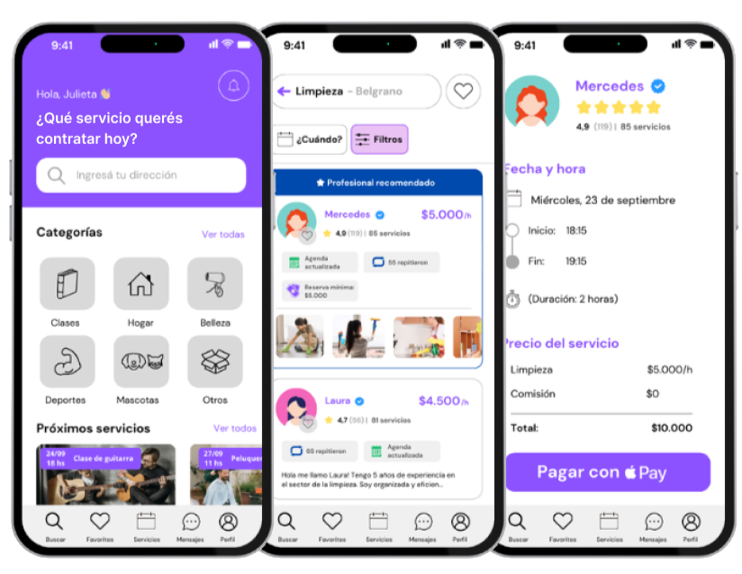 Sabés exactamente cuánto cuesta el servicio antes de contratar. ¿Lo mejor? Pagás con tarjeta directamente desde la app recién cuando el servicio se completa.